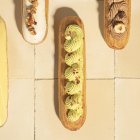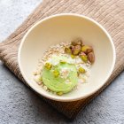 Густая кремообразная паста темно-зеленого цвета со вкусом и ароматом фисташковых орехов. Используется для ароматизации и придания цвета кремам, десертам и мороженому. Дозировка: 80-120 г. пасты на 1 кг. массы. Перед употреблением пасту тщательно перемешать. Открытую упаковку хранить в холодильнике.